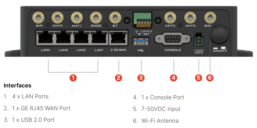 The FortiExtender Vehicle 511G interface includes 4 LAN ports and 1 WAN port, featuring a digital I/O port for external device control, as well as Console and USB 2.0 ports for out of band management (OOB).